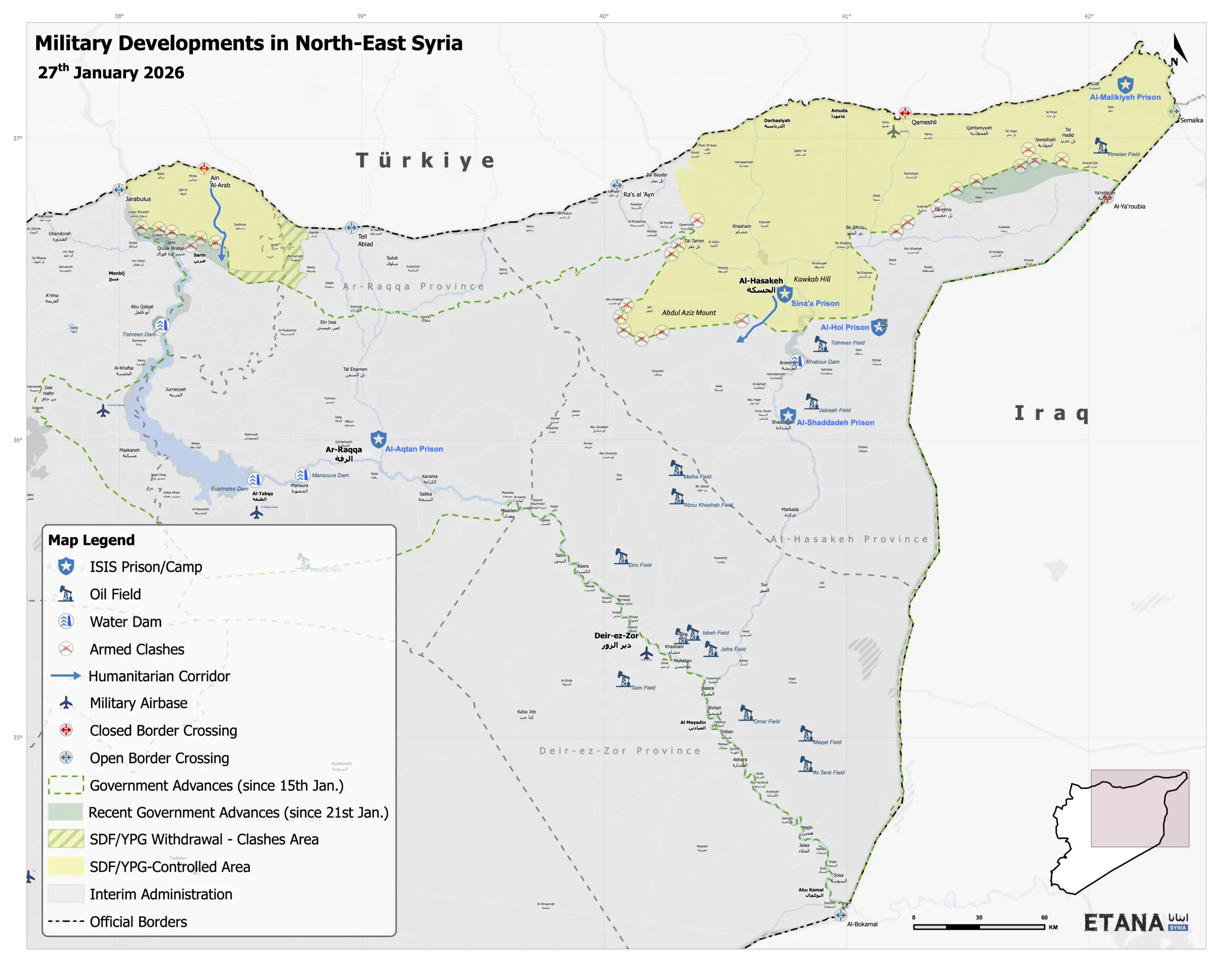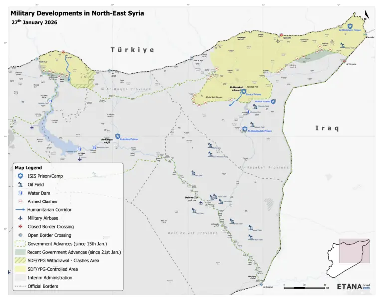 Dozens of SDF fighters holed up in the Al-Aqtan prison relinquished control of the facility, evacuating to Kobane/Ain al-Arab starting on 23rd January. The prison is now fully under the control of interim military police. State TV reported that 126 minors were released from the prison, having been previously detained by the SDF. One minor interviewed by SANA said they were tortured with electricity; videos of this interview were shared widely across social media over the weekend, with pro-government Syrians pointing to it as evidence of the SDF’s lack of legitimacy. Other prisoners’ files are currently under review by Syrian Attorney General Hassan al-Turba and Raqqa’s chief prosecutor.